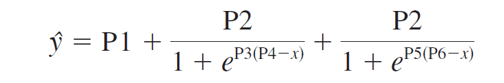 【方法】 岩手県花巻市大迫町の住民1,535名を平均16.6年追跡し、自由行動下血圧で捉えられた血圧サージパワーの予後予測能を検討した。血圧サージパワーを求めるため24時間にわたる個人ごとの血圧推移を以下のモデルにフィッティングさせた。本モデルは血圧の生データとの適合度が、一般的に汎用されるコサイナー法よりも高いという利点がある。なお、x:時刻、y:血圧、e:自然対数、P1~P6:定数である。就寝中血圧 - 覚醒中血圧の差はP2。起床時の血圧上昇速度である傾きは本モデルの時間微分で与えられP2×P5÷4である。そのため、血圧サージパワーは両者を乗じたP2×P2×P5÷4として算出した。