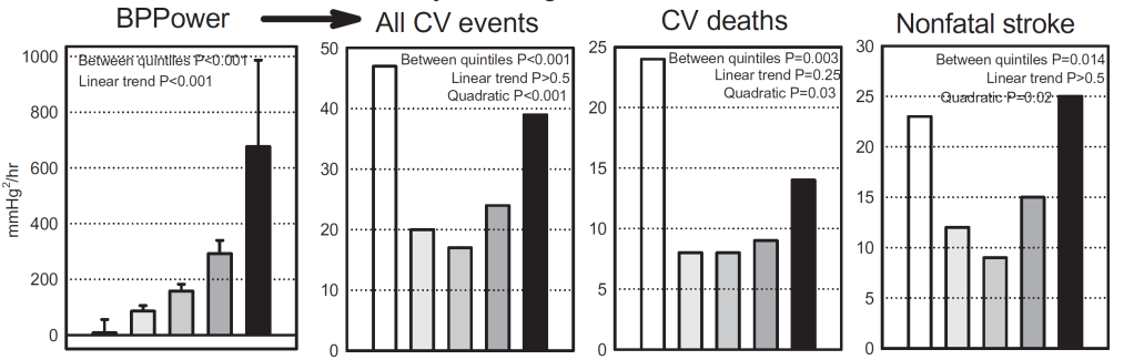【結果】 血圧サージパワーは、男性では脳心血管疾患発症割合と明確な関連を示さなかったが、女性において全脳心血管疾患イベント、脳心血管死亡および非致死的脳卒中発症リスクとU字型の関連を示し、年齢、夜間の平均血圧、および喫煙状況で調整後もU字型の関連は有意であった。降圧薬内服していない女性に限定しても同様の傾向であった。 【結論】 血圧サージパワーと脳心血管病の予後との関連の機序として、モーニングサージと血管壁のずり応力(shear stress)との関連や、筆者らが過去に報告した血圧サージパワーと交感神経系の亢進との関連の関与が想定されるが、血圧サージパワーの予後予測能が、男性ではなく女性のみ明瞭である理由は不明であり今後の研究が待たれる。結論として、女性では血圧サージパワーが独立した脳心血管疾患発症の予測因子になる可能性が示唆された。
