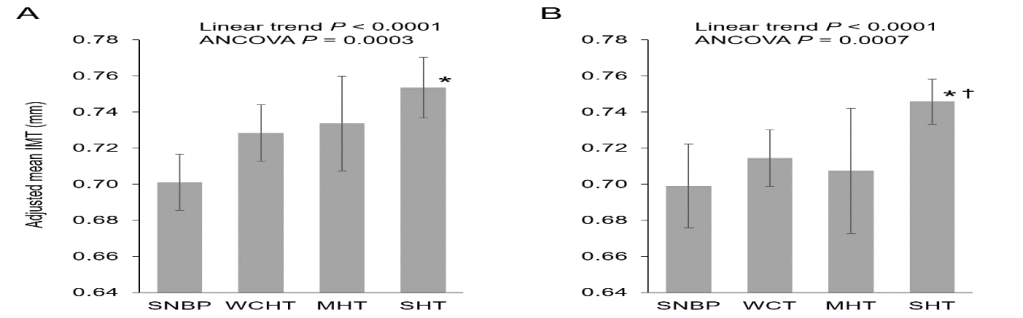 および持続性高血圧(SHT)の対象者の頸動脈中膜内膜複合体厚(IMT)