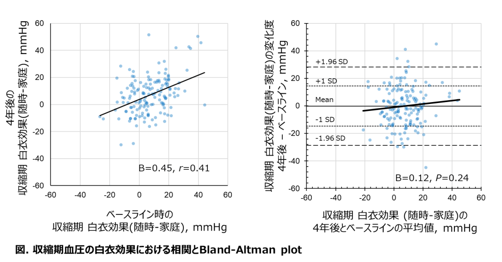 白衣効果の集団における平均値はベースラインと4年後でほぼ一致していた。しかし、ICCの値から白衣効果の4年後の再現性は良好とは言えなかった。家庭血圧に比べ、診察室血圧の4年後の再現性が低いことから、白衣効果の低い長期再現性には診察室血圧のばらつきが大きく寄与していることが示唆される。